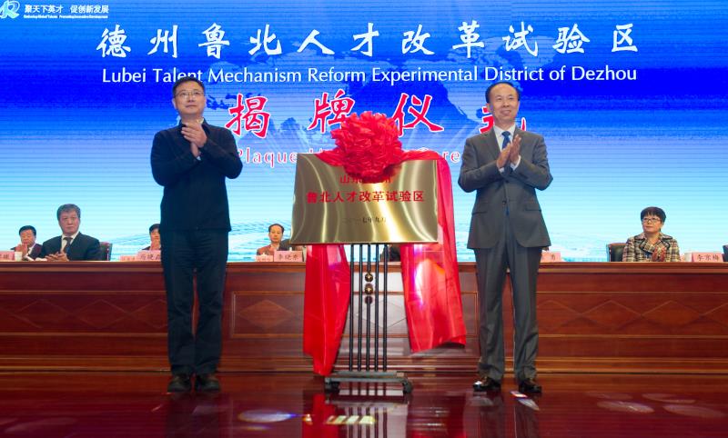 陈勇、马晓磊为德州鲁北人才改革试验区揭牌。李京梅、李晓东、陈勇、陈飞、韩金峰、马晓磊共同启动第二届智汇德州人才创新创业周活动。
